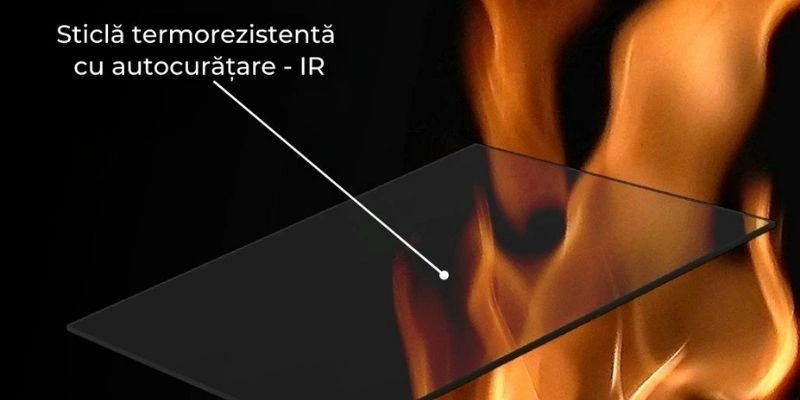 Partea importanta este componenta IR, adica legatura cu radiatia infrarosie. Mai exact, sticla termorezistenta IR reflecta o parte din radiatia termica inapoi in camera de ardere. Astfel, zona din interiorul focarului ramane mai calda, iar suprafata interioara a sticlei ajunge si ea la o temperatura ridicata.