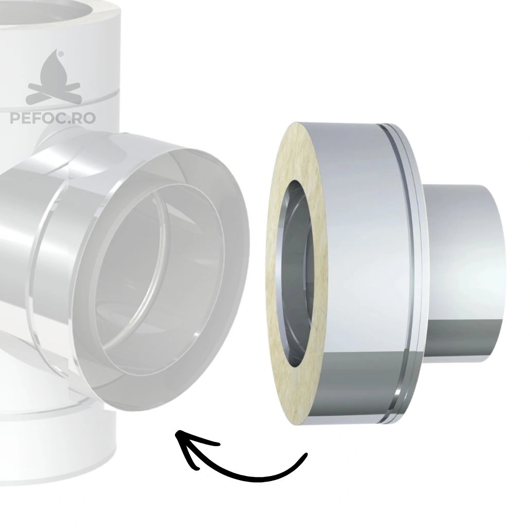 Adaptorul se monteaza intre ultimul tronson de burlan simplu si inceputul sistemului. Se fixeaza etans, permitand conectarea corecta intre tubulatura neizolata si cea izolata, fara pierderi de fum sau caldura. Este ideal pentru racorduri de sobe, seminee sau cazane la cosuri de fum dublu perete.