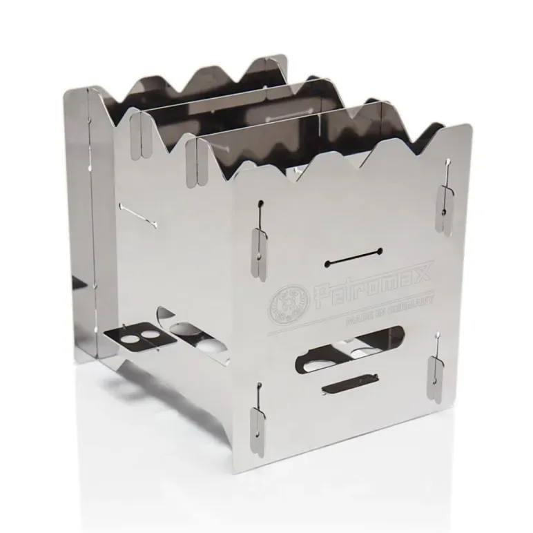 Arzator cu carbuni portabil Petromax din inox, robust si usor de manevrat, cu efect de semineu pentru ardere eficienta a surcelelor si lemnisoarelor.