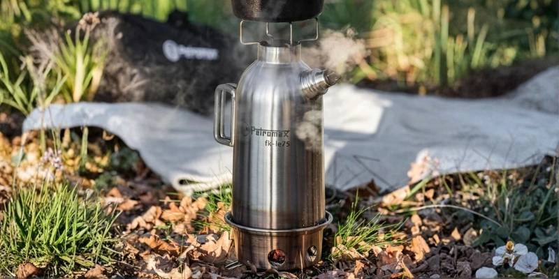 Arzator fierbator inox Petromax 1.5 litri fierbe rapid apa in aer liber prin efect de semineu, semnalizeaza fierberea cu fluier de abur si cu suportul inclus permite incalzirea portiilor mici fara cartuse cu gaz.