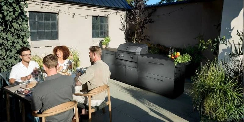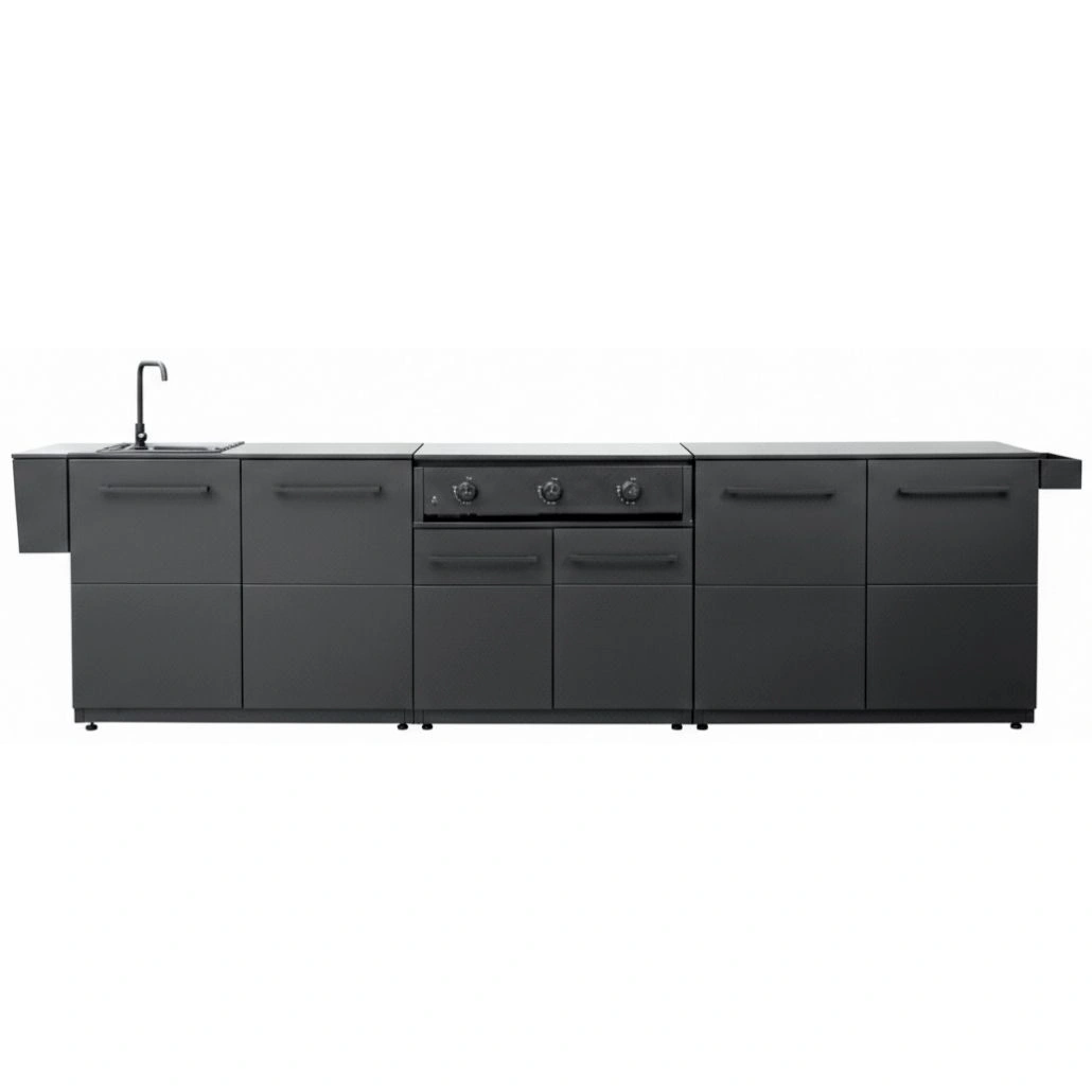 Cu gama COZZE, ai totul pregatit pentru seri reusite la gratar, fara batai de cap: pe 310 cm ai chiuveta integrata, blat de lucru si spatiu generos de depozitare, plus gratarul Combo 900 pentru gatit variat in aer liber. Materialele sunt facute pentru exterior, cu otel galvanizat vopsit in camp electrostatic si HPL foarte rezistent la intemperii, astfel incat bucataria poate ramane afara tot anul. Aspectul negru mat completeaza un ansamblu modern, potrivit atat pentru terasa, cat si pentru curte.