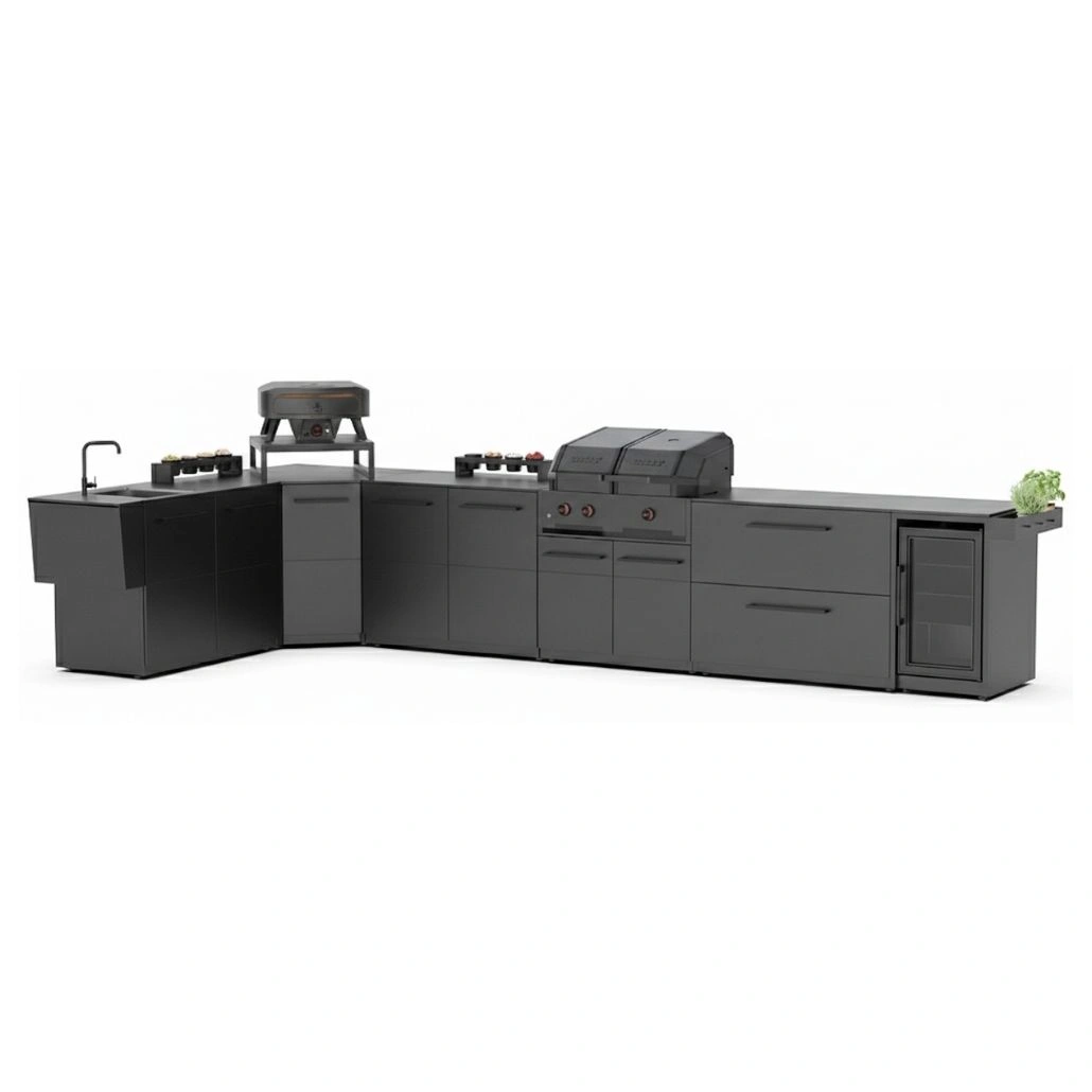 Bucatarie exterioara XXL in forma de L, este pregatita pentru seri lungi afara, cu gratar, gatit si servire pe masura unui spatiu generos. Acest pachet complet XXL ofera dotari pentru gratar, gatit si servire la nivel mare, de la chiuveta integrata si frigiderul exclusiv cu usa din sticla, pana la gratarul combinat Quattro 900 si un cuptor de pizza cu piatra rotativa. Datorita materialelor robuste, precum otelul galvanizat vopsit cu pulbere si HPL foarte rezistent la intemperii, bucataria este pregatita pentru utilizare pe tot parcursul anului in exterior si arata excelent.