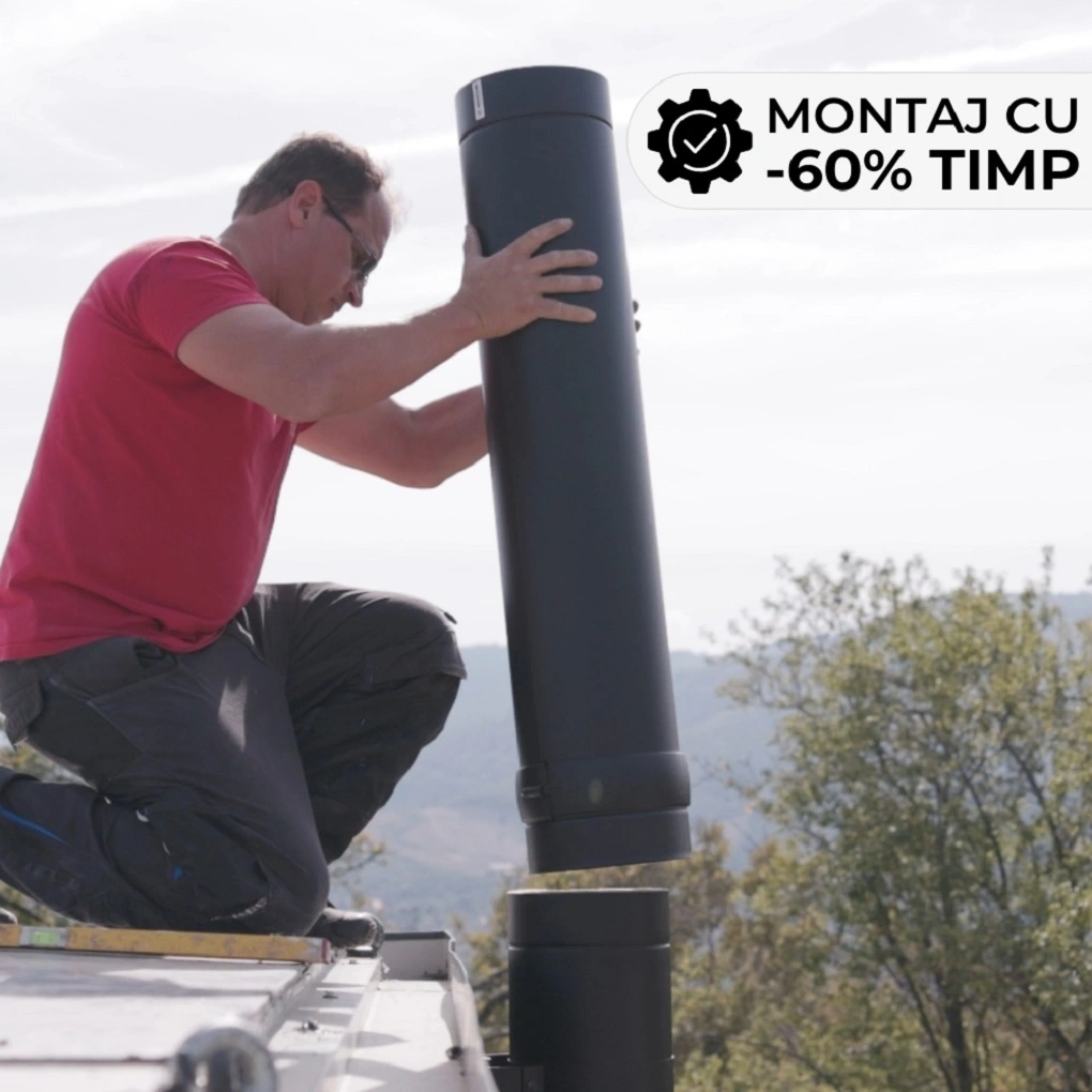 Permite montaj autoportant pe 3 metri fara ancoraj, cu prindere intermediara la fiecare 13 metri. Este potrivit pentru aplicatii casnice, comerciale sau industriale, oferind eficienta si durabilitate pentru orice nevoie de evacuare.