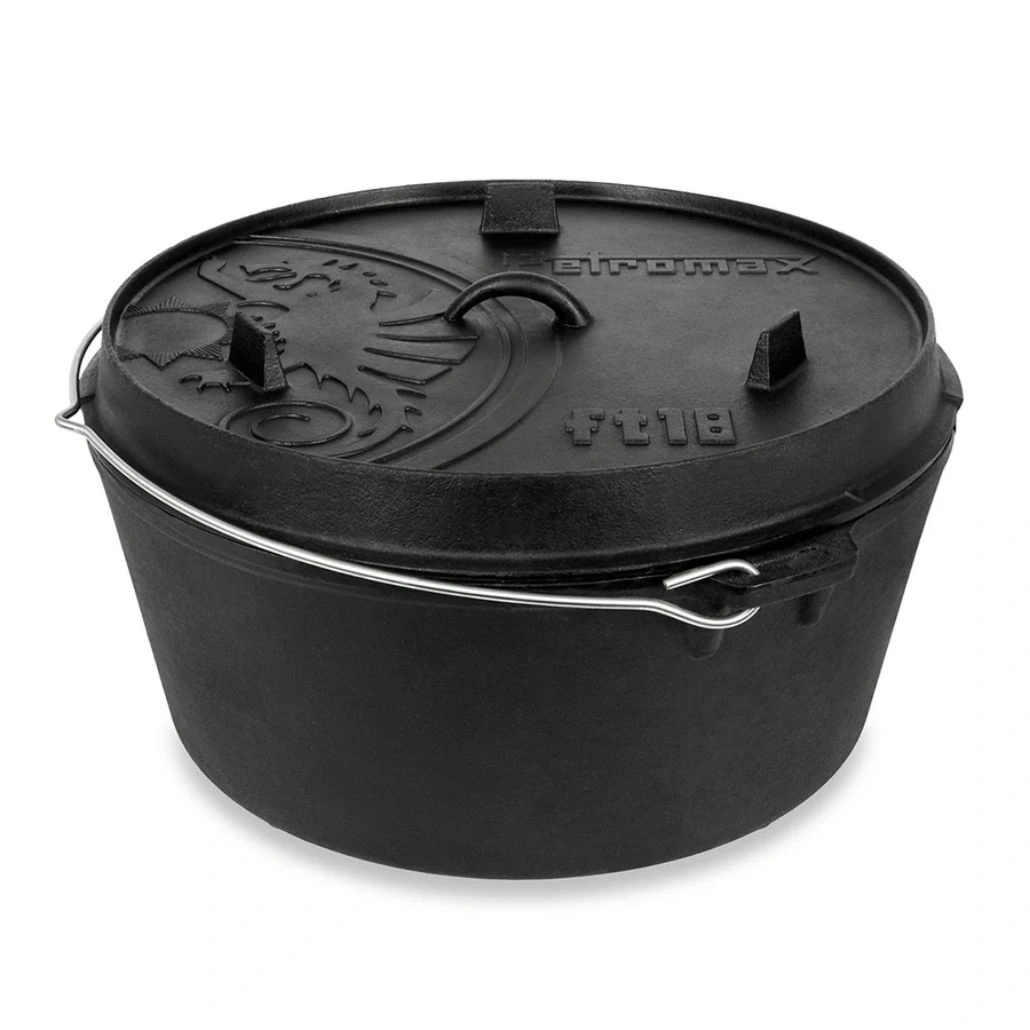 Ceaunul fonta Petromax cu fund plat este conceput pentru gatit in cantitati mari, fiind varianta cu cea mai mare capacitate din gama Petromax. Capacitatea totala maxima ajunge la 18.1 litri cu capac, ceea ce il face potrivit pentru prepararea mancarii la ceaun pentru peste 20 de persoane, in contexte precum intalniri de familie, evenimente in aer liber sau mese cu prietenii. Fonta distribuie caldura constant si o mentine pentru timp indelungat, avantaj important pentru retete care cer fierbere lenta sau gatire uniforma. Capacul din fonta din dotare aduce versatilitate: poate fi folosit ca tigaie din fonta cu capacitate de 2.7 litri, dar si ca platou de servire din fonta, pastrand caldura mai mult timp. Astfel, acelasi set permite gatit la ceaun olandez, rumenire in capac si servire directa, fiind potrivit pentru preparate traditionale la ceaun si portii mari.