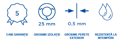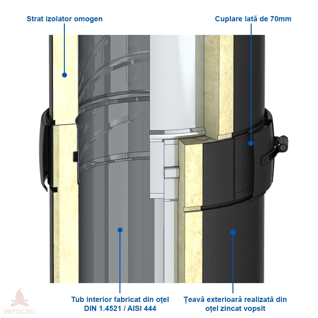 In plus, sistemul de cos de fum mai are si un strat izolant omogen, cu grosime de 20 si de 50 de mm, realizat din lana minerala de inalta calitate cu o densitate de 120 kg/m³ in stare comprimata. Acesta functioneaza pana la temperaturi de 450 °C, fiind testat pentru temperaturi care ajung chiar la 600 °C