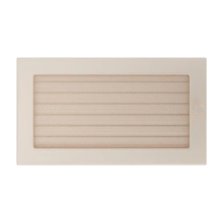 Model de grila prevazuta cu jaluzea, realizata din material metalic vopsita in culoarea crem avand dimensiunea de 17/30 cm.