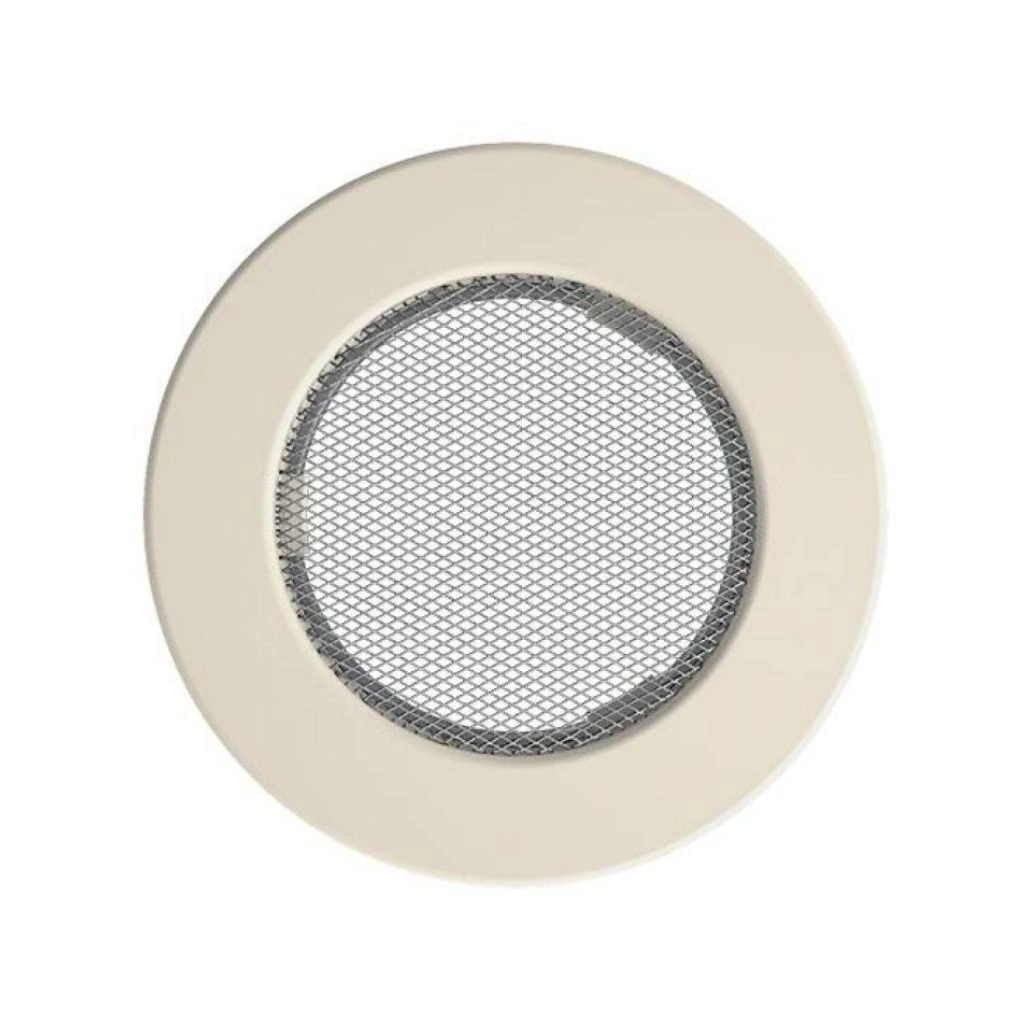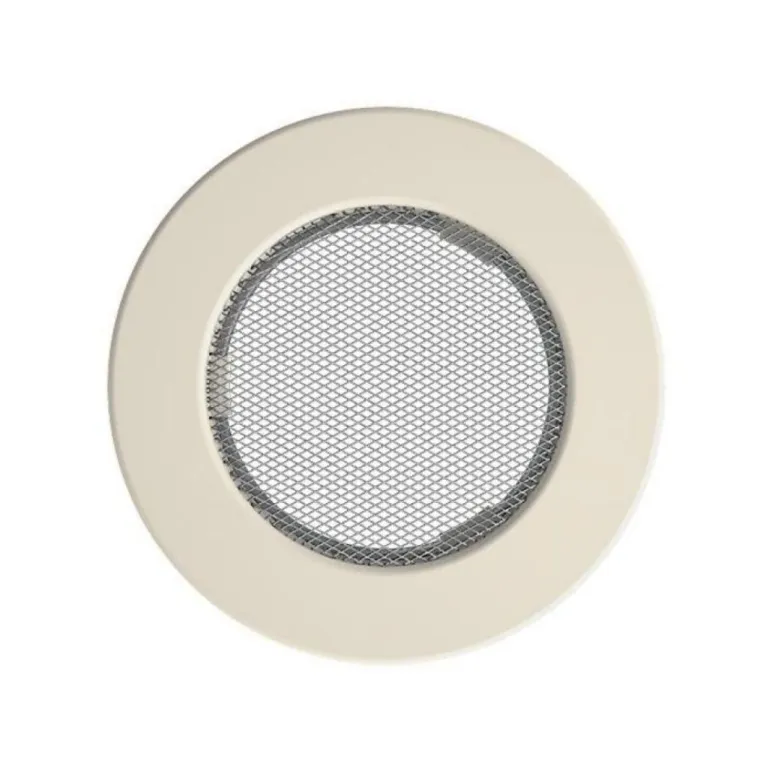 Grila rotunda crem, fabrictata din metal rezistent, asigura aerisire eficienta pentru seminee si incalzire, integrandu-se armonios in orice stil de interior.