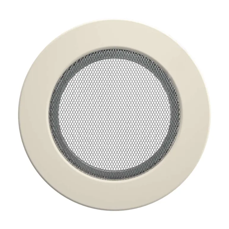 Grila rotunda crem, fabrictata din metal rezistent, asigura aerisire eficienta pentru seminee si incalzire, integrandu-se armonios in orice stil de interior.