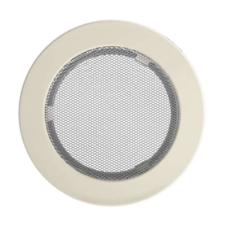 Grila rotunda crem, fabrictata din metal rezistent, asigura aerisire eficienta pentru seminee si incalzire, integrandu-se armonios in orice stil de interior.