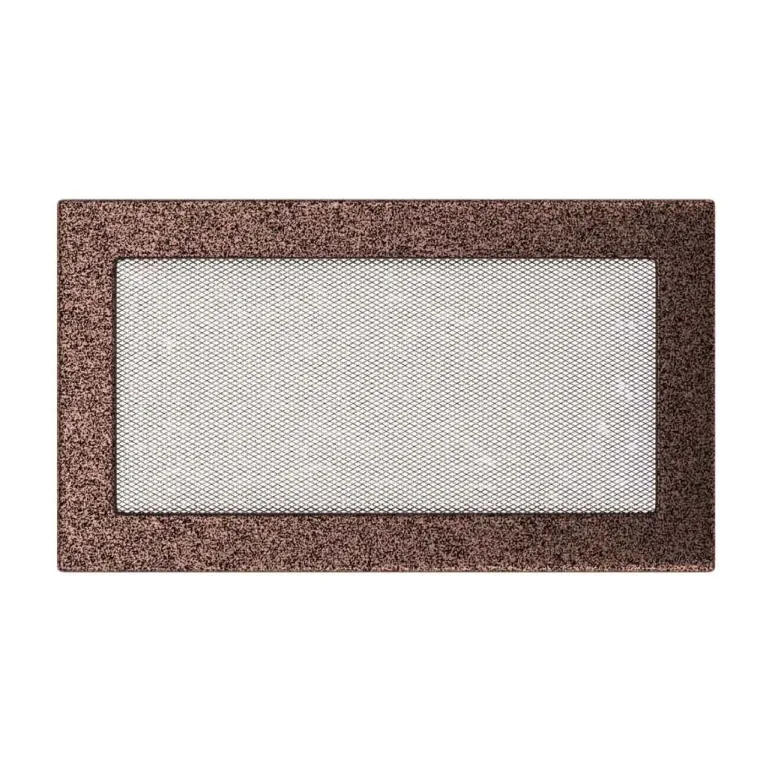 Model de grila metalica de culoarea cuprului, ce include rama detasabila pentru seminee pe lemne, cu dimensiunile de 17/30 cm.