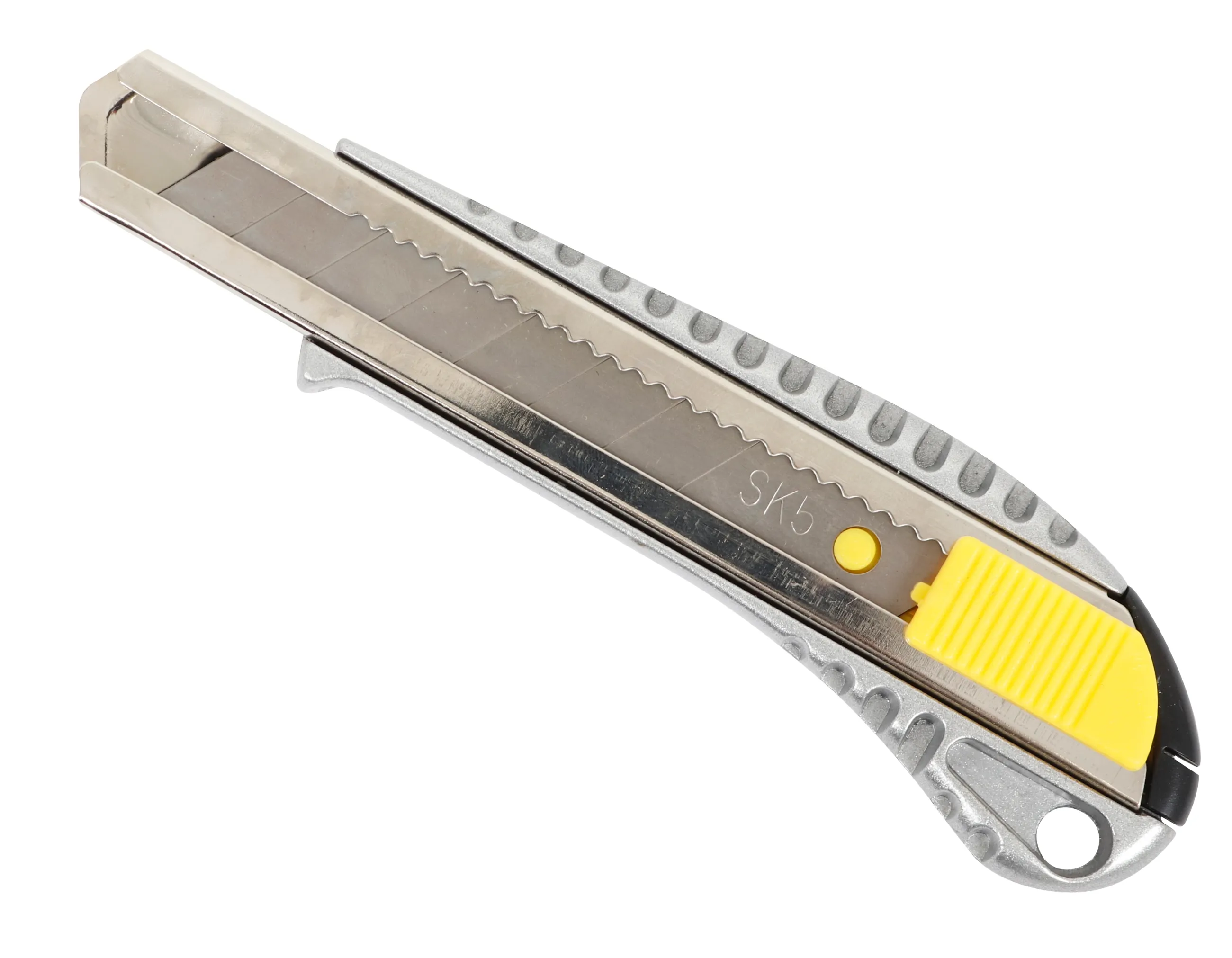 Cutterul Millarco de 18 mm este realizat din metal rezistent si are lama din otel SK5, oferind taiere precisa si durabila pentru hartie, carton, folie sau alte materiale usoare. Butonul galben permite reglarea lamei rapid si sigur, extinzand sau retragand sectiunile uzate, astfel incat sa poti lucra continuu fara intreruperi. Corpul gri argintiu completeaza designul ergonomic si robust, asigurand confort si control in timpul utilizarii. Constructia solida face cutterul un instrument fiabil pentru birou, atelier sau acasa, iar depozitarea se poate face cu usurinta datorita formei compacte. Acest cutter combina durabilitatea metalului cu precizia lamei SK5, oferind performanta constanta in orice tip de lucrare de taiere.