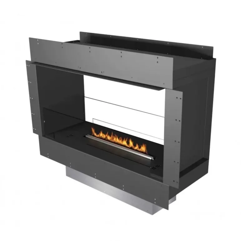 Focar incastrabil pe bioetanol, in configuratie tunel, cu cadru metalic pentru montaj in mobilier sau pereti decorativi, control automat din telecomanda ori aplicatie, flacara in 6 trepte si fara cos de fum.