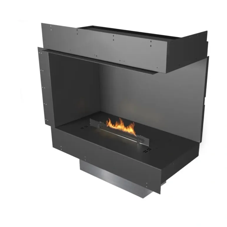 Focar incastrabil pe bioetanol cu rama tip colt dreapta, pentru integrare in perete sau mobilier. Flacara reala fara cos de fum, control din panou tactil, telecomanda si aplicatia Planika, cu tehnologie BEV si realimentare automata.
