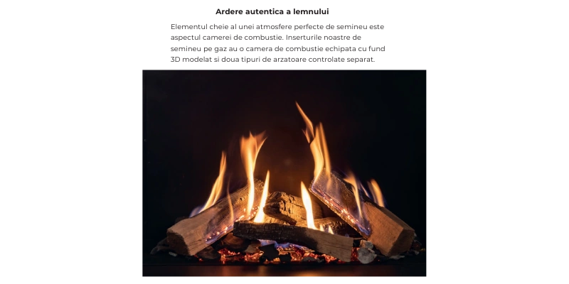 Atmosfera unui semineu depinde in mare masura de naturaletea flacarilor si de aspectul camerei de combustie. Inserturile noastre pe gaz sunt proiectate pentru a recrea fidel senzatia unei arderi reale de lemn, oferind un efect vizual profund si convingator. Fundul 3D modelat imita structura si textura vetrei unui foc real, iar cele doua tipuri de arzatoare controlate separat permit reglarea intensitatii flacarii, variatii vizuale naturale si o functionare eficienta, adaptata preferintelor utilizatorului. Aceste detalii transforma insertul pe gaz intr-o solutie care reda fidel aspectul si atmosfera unei arderi clasice de lemn, oferind o experienta vizuala calda si naturala, cu flacari dinamice, profunzime realista si un joc de lumini similar focului traditional. In acest fel, te poti bucura de confortul si eleganta unui foc autentic, dar cu avantajele unei functionari moderne, curate si usor de controlat.