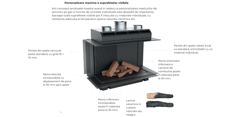 Produsele sunt proiectate pentru a permite un nivel ridicat de personalizare, astfel incat insertul de semineu pe gaz sa poata fi adaptat perfect cerintelor estetice si tehnice ale fiecarui proiect. Aproape toate suprafetele vizibile pot fi inlocuite cu materiale rezistente la temperatura, precum piatra naturala sau ceramica. Peretele din spate poate fi livrat standard neted sau peste standard nervurat, cu grila 10 × 10 mm. Rama laterala permite deplasarea de pana la 30 mm spre spate, iar rama exterioara inferioara si rama inferioara incorporabila pot fi coborate pana la 30 mm. Lemnele ceramice sunt disponibile in culoare naturala sau neagra, completand astfel aspectul personalizabil al camerei de combustie.