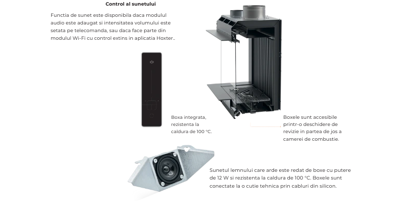 Sistemul este conceput pentru a oferi acces facil la componente, siguranta ridicata si functionalitati moderne, precum iluminare LED, control prin Bluetooth si redarea sunetului lemnului care arde. Focarul dispune de arzatoare secundare integrate si un fund 3D modelat, care creeaza efectul realist al focului. Constructia solida, cutia tehnica Hoxter cu control independent si posibilitatea de conectare a setului de masa de acumulare asigura o functionare eficienta si confortabila. Ramele si suprafetele vizibile pot fi complet personalizate, focarul include setul de masa de acumulare cu greutate volumetrica de 3 250 kg/m³, oferind eficienta termica sporita, precum si setul audio cu modul Wi-Fi pentru o experienta sonora completa si realista a atmosferei de semineu.