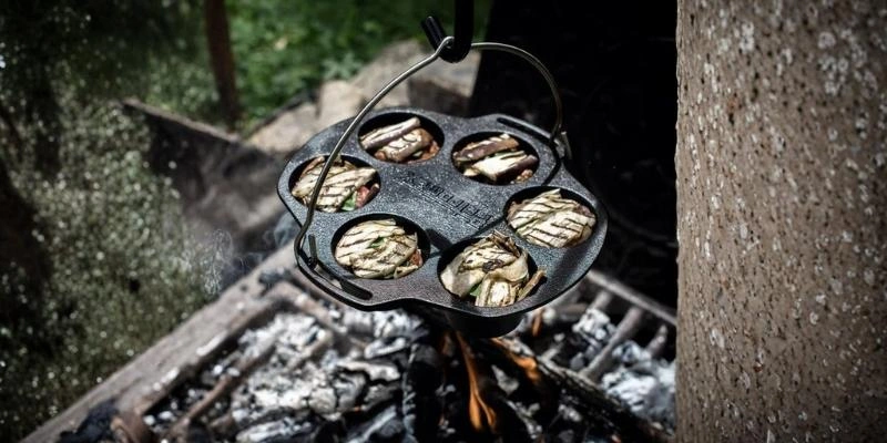 Forma de copt Petromax din fonta are sase locasuri pentru coacerea de briose, dar este la fel de utila si pentru oua cu bacon, quiche, tarte individuale si alte preparate in portii mici. Poate fi folosita direct deasupra focului, in jarul fierbinte sau in cuptorul de acasa, iar manerul practic cu crestatura ajuta la manevrare. In plus, forma se potriveste in ceaunele olandeze Petromax FT6 si FT9, pentru coacere controlata in fonta. Fonta stocheaza caldura si o transmite constant catre preparate, iar designul si structura suprafetei sustin distribuirea eficienta a temperaturii. Pentru utilizarea in ceaunul olandez FT9, este recomandata o pirostrie sub forma, astfel incat fonta sa fie usor separata de fonta, pentru protectie si utilizare corecta la temperaturi ridicate. Indiferent daca preparatul este dulce sau sarat, forma ramane un accesoriu versatil, potrivit pentru bucataria de afara si pentru cea de acasa.