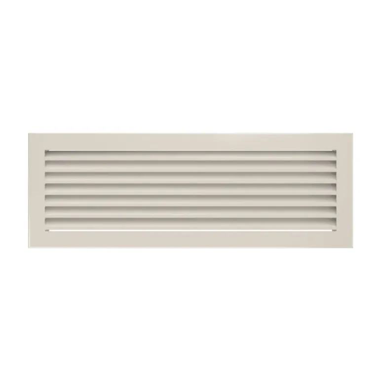 Model de grila metalica crem, vopsita electrostatic, cu lamele fixe, design modern si elegant, dimensiuni 17x49 cm.