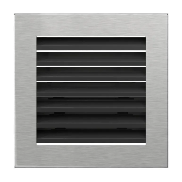 Grila moderna cu rama din inox si lamele fixe integrate, avand dimensiunile 17x17 cm, ofera un aspect elegant si durabil.