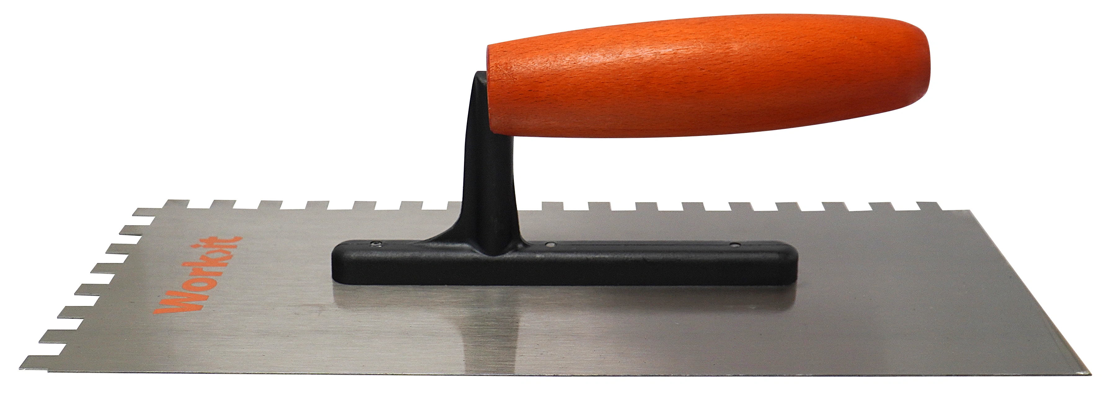 Gletiera zimtata are dimensiunile de 280 Ã 130 mm si este prevazuta cu dinti la o distanta de 8 mm intre crestaturi. Este realizata din otel carbon de inalta calitate, cu grosime de 0,6 mm, ceea ce ii confera rezistenta in utilizare. Suprafata zimtata este destinata distribuirii uniforme a materialelor, iar manerul vopsit portocaliu asigura o prindere confortabila si stabila in timpul lucrului. Aceasta gletiera este potrivita pentru lucrari de constructii si placari, fiind o unealta utila in procesul de aplicare a materialelor adezive.