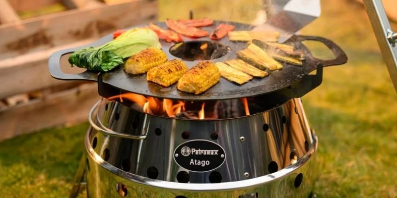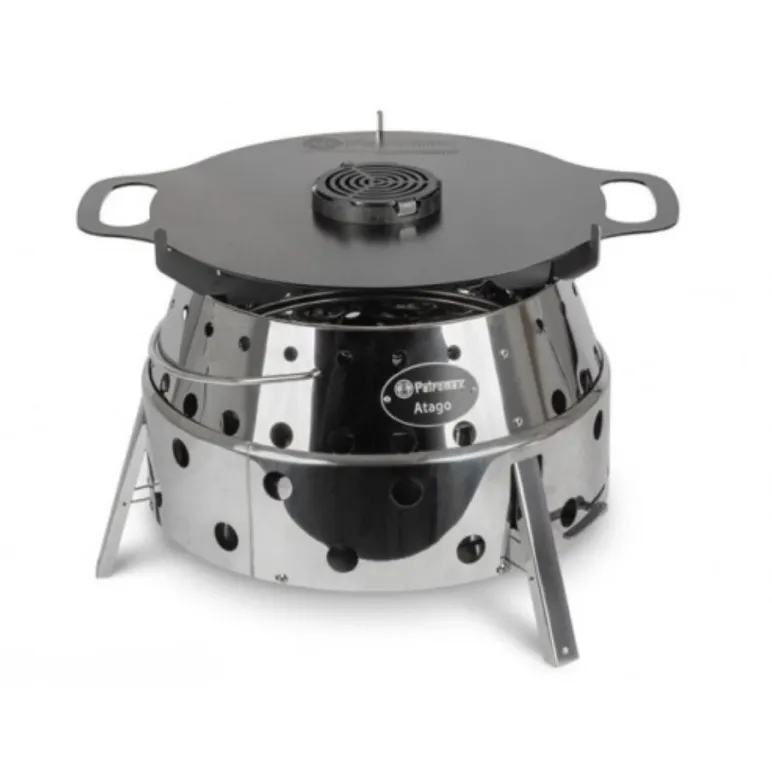 Atago cu plancha este un set portabil pentru gatit pe carbuni, cu placa groasa din fier forjat si doua insertii pentru fript, grill si vase.