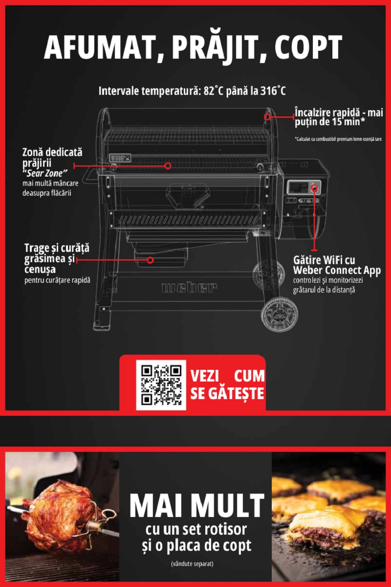Gratarul pe peleti Weber iti ofera arome intense si preparate perfecte printr-o combinatie unica de afumare, coacere si prajire. Acest gratar pe peleti are un spatiu de gatit generos, un sistem de control digital si functii avansate pentru pregatirea preparatelor.