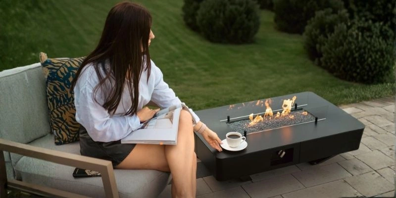 Focarul liniar al mesei Rio este protejat pe ambele laturi de panouri din sticla, care delimiteaza zona flacarii si ofera o vizibilitate buna din mai multe unghiuri, pastrand in acelasi timp un aspect curat si elegant. In interior, pietrele decorative contribuie la un efect vizual placut, accentuand conturul flacarilor si reflexiile in sticla. Lumina rezultata este calda si uniforma, potrivita pentru seri linistite pe terasa sau in curte, fara sa incarce vizual spatiul. Atmosfera creata se potriveste atat intalnirilor cu prietenii, cat si momentelor de relaxare, la cafea sau la un pahar de vin. In combinatie cu designul mesei, flacara devine un punct central discret, care completeaza natural zona de relaxare.
