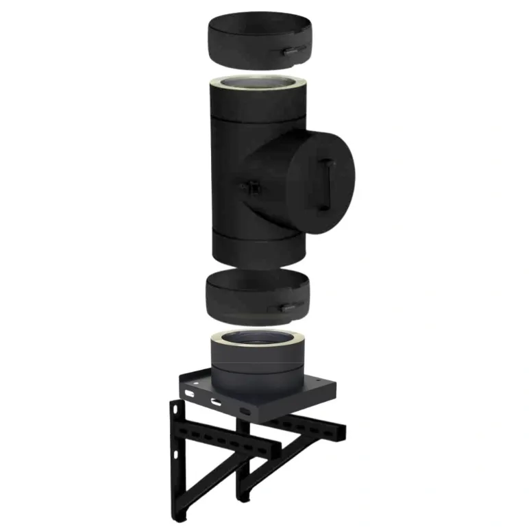 Kitul de baza DW-Black 50 fi 200, varianta suspendata, este destinat zonei inferioare a cosului de fum atunci cand sistemul se sustine pe console. Include usa de vizitare pentru inspectie si intretinere, pastrand finisajul negru mat specific DW-Black.
