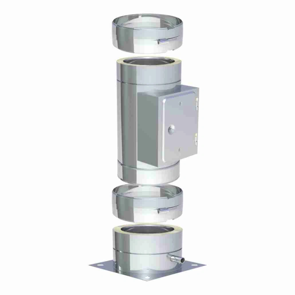 Kit baza cos fum DW-Eco fi 250, montaj de pe sol, cu usa de vizitare, pentru zona inferioara a cosului si acces rapid la inspectie si curatare. Sistem dublu perete din inox, diametru exterior 350 mm, potrivit pentru instalatii pe combustibil solid.