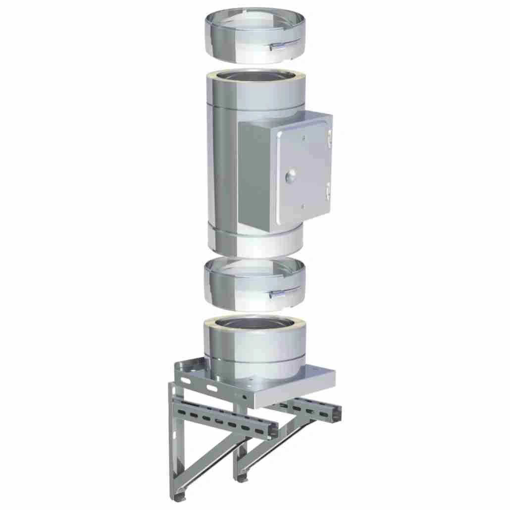 Kitul elemente baza DW-Eco fi 250 este destinat montajului suspendat, cand cosul de fum se sustine pe console, iar partea de jos trebuie organizata pentru acces si intretinere. Usa de vizitare permite inspectia si curatarea depunerilor, iar scurgerea de condens in partea inferioara ajuta la evacuarea controlata a umezelii. Este o solutie potrivita pentru instalatii pe combustibil solid, cu aspect inox si configurare corecta a bazei cosului.