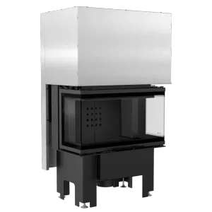 Focarul cu sticla pe trei laturi, cu deschidere verticala, prin glisarea usii, ce ofera un plus de confort acestuia si un design modern. Usa este prevazuta si cu deschidere standard, orizontala, pentru o curatare usoara a sticlei. Focarul este echipat la nivelul conului cu sistem de recuperare a caldurii, compus din tevi orizontale ce preiau din caldura gazelor de evacuare, crescand eficienta acestuia. Datorita samotei din interior si a sistemului de ardere pe vatra, procesul de ardere al lemnului este mai amplu, rezultand astfel reziduri de cenusa reduse. Focarul este dotat cu un con de evacuare reglabil la 360 grade, pentru o racordare facila la cosul de fum.