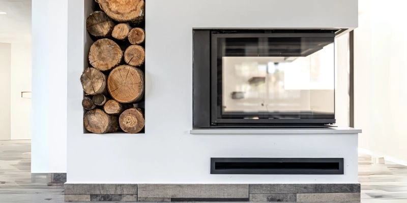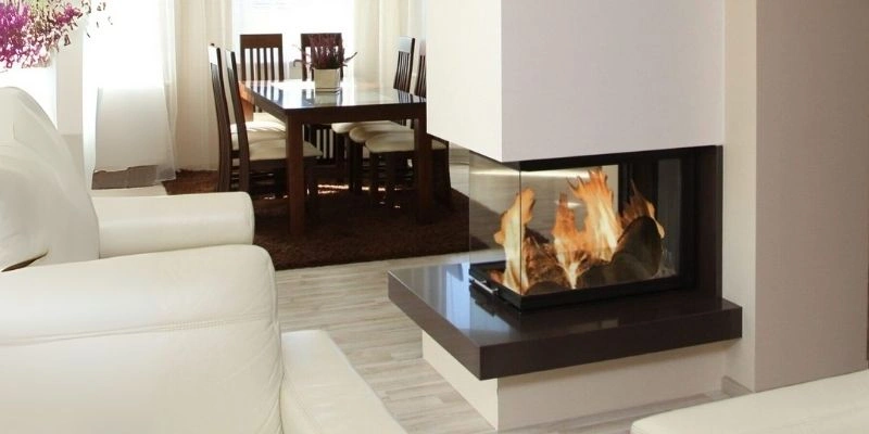 Focar de semineu NBU cu 3 laturi de sticla, montat intr-un living open-space.