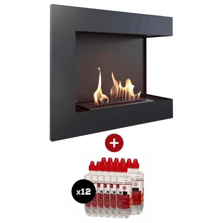 Pachetul DELTA Negru colt dreapta inclus cu bioetanol imbina eleganta si functionalitatea intr-un design modern de colt, ideal pentru interioare open-space sau camere conectate. Biosemineul ofera vizibilitate dubla a flacarii, creand un efect decorativ spectaculos si o atmosfera calda, fara fum, fara miros si fara cos de evacuare. Fabricat din otel de inalta calitate si vopsit termorezistent, include un rezervor certificat TÜV cu insertie absorbanta si control al flacarii pentru ardere sigura si economica. Bioetanolul inclus, combustibil ecologic pe baza vegetala, asigura o flacara curata si stabila, eliberand doar vapori de apa si cantitati reduse de CO2.