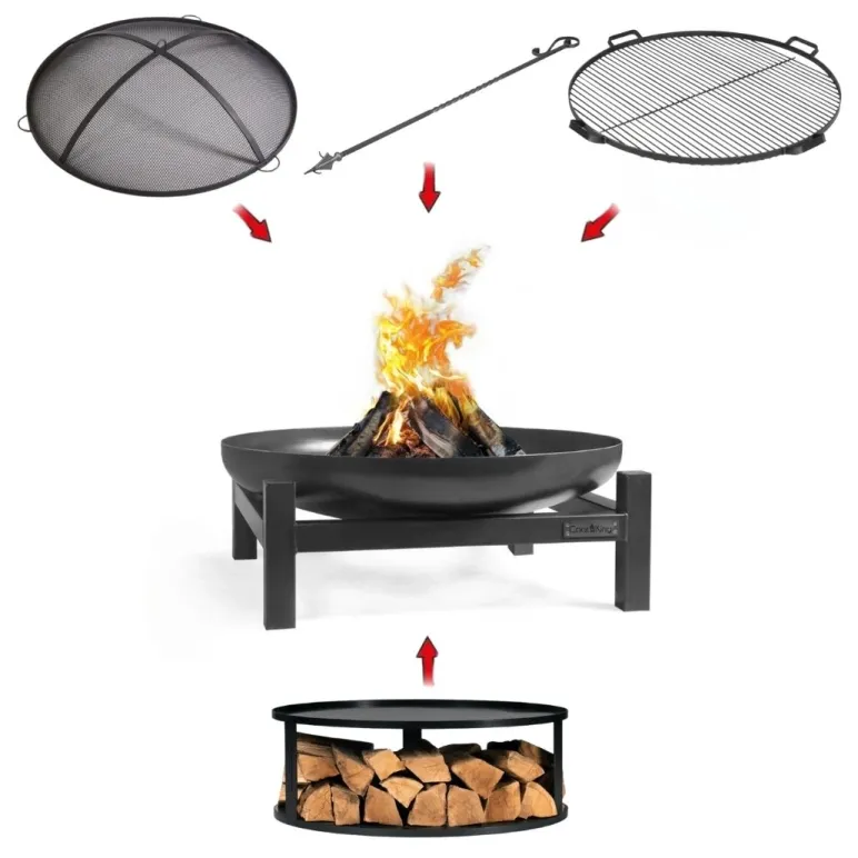 Accesoriile pentru vatra de foc CookKing, realizate manual in Europa, includ capacul antiscantei pentru siguranta si curatenie, grilajul din otel pentru gatit stabil si eficient, baza pentru protectia suprafetelor si stabilitate, precum si carligul din fier forjat, ideal pentru manevrarea lemnelor aprinse in conditii de siguranta.