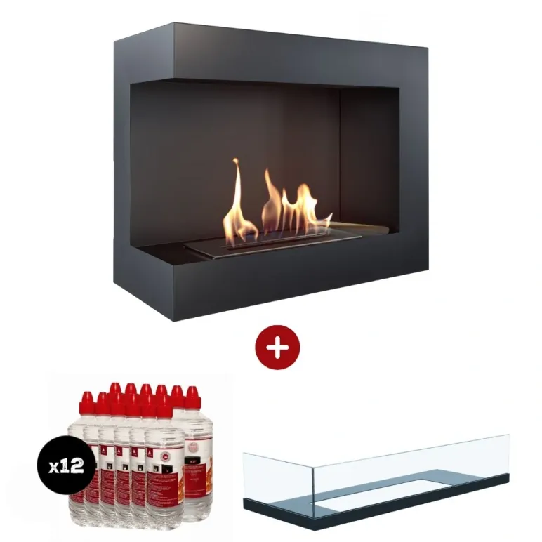 Pachetul DELTA Negru colt stanga - 60 x 48 x 28 cm + sticla biosemineu + 12L bioetanol imbina eleganta si functionalitatea intr-un design modern de colt, ideal pentru interioare open-space sau camere conectate. Biosemineul dotat cu sticla de protectie, ofera vizibilitate dubla a flacarii, creand un efect decorativ spectaculos si o atmosfera calda, fara fum, fara miros si fara cos de evacuare. Fabricat din otel de inalta calitate si vopsit termorezistent, include un rezervor certificat TÜV cu insertie absorbanta si control al flacarii pentru ardere sigura si economica. Bioetanolul inclus, combustibil ecologic pe baza vegetala, asigura o flacara curata si stabila, eliberand doar vapori de apa si cantitati reduse de CO2.