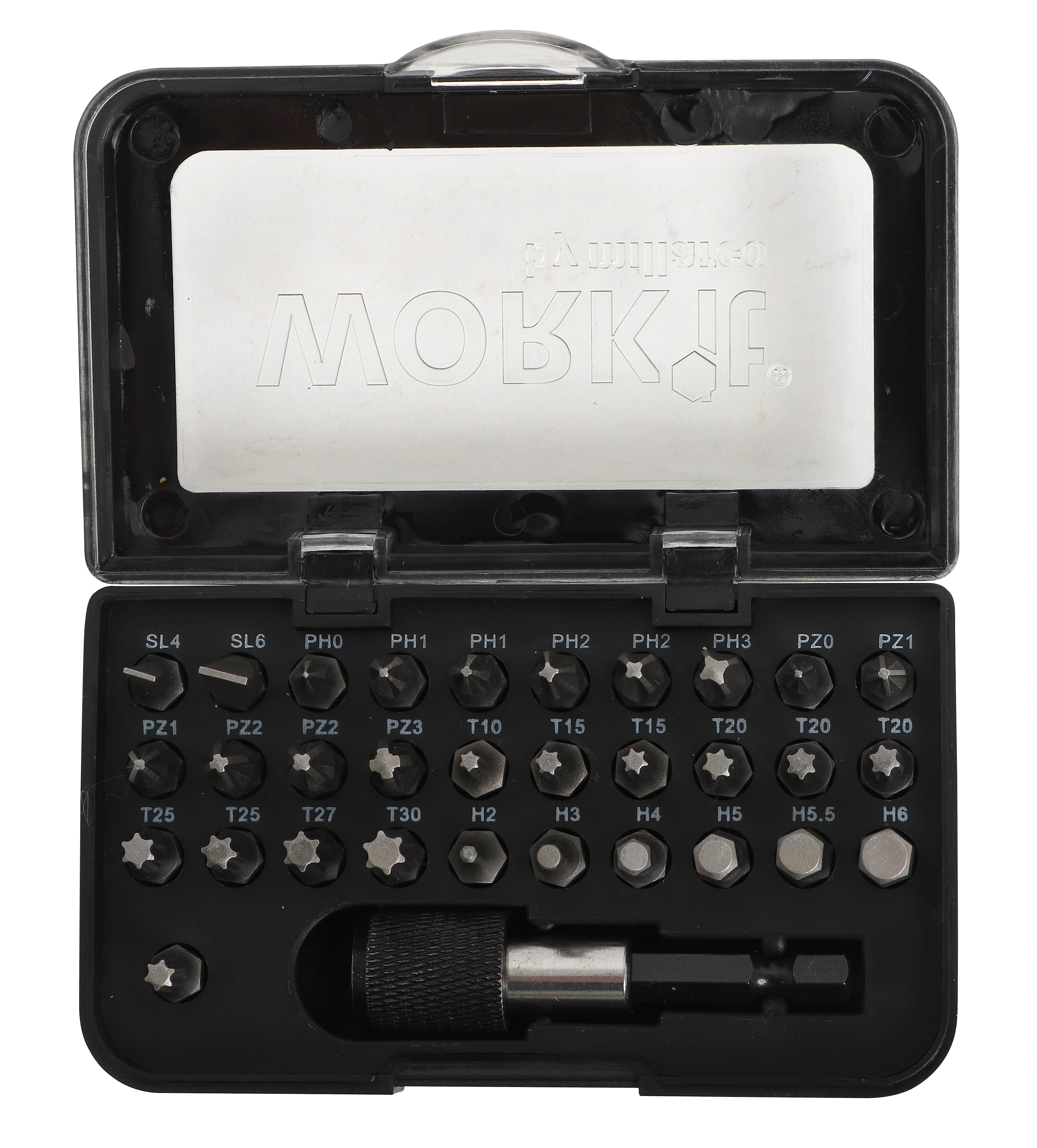 Setul de biti Millarco contine 32 de piese si este fabricat din otel CR-V durificat, ceea ce ii asigura rezistenta si durabilitate in timp. Setul vine intr-o cutie practica, prevazuta cu clipsuri pentru centura, pentru a putea fi transportat usor si pentru a avea acces rapid la fiecare piesa atunci cand este necesar.Kitul include 31 de biti de 25 mm, acoperind o gama variata de tipuri si dimensiuni. Sunt inclusi biti drepti (SL) de 4 si 6 mm, biti PH in variantele PH0, 2ÃPH1, 2ÃPH2 si PH3, precum si biti PZ in variantele PZ0, 2ÃPZ1, 2ÃPZ2 si PZ3. Pentru lucrari care necesita imbinarile TORX, setul contine T10, 2ÃT15, 3ÃT20, 2ÃT25, T27 si T30. De asemenea, pentru suruburi hexagonale sunt disponibili biti H2, H3, H4, H5, H5.5 si H6.Setul include si un adaptor quick release, care permite schimbarea rapida si usoara a bitilor pe surubelnite compatibile sau pe manere cu clichet. Aceasta trusa este compacta si versatila, fiind ideala pentru lucrari de intretinere, montaj si reparatii acasa sau in atelier, oferind o solutie completa pentru orice utilizator care are nevoie de un set de biti bine organizat si fiabil.