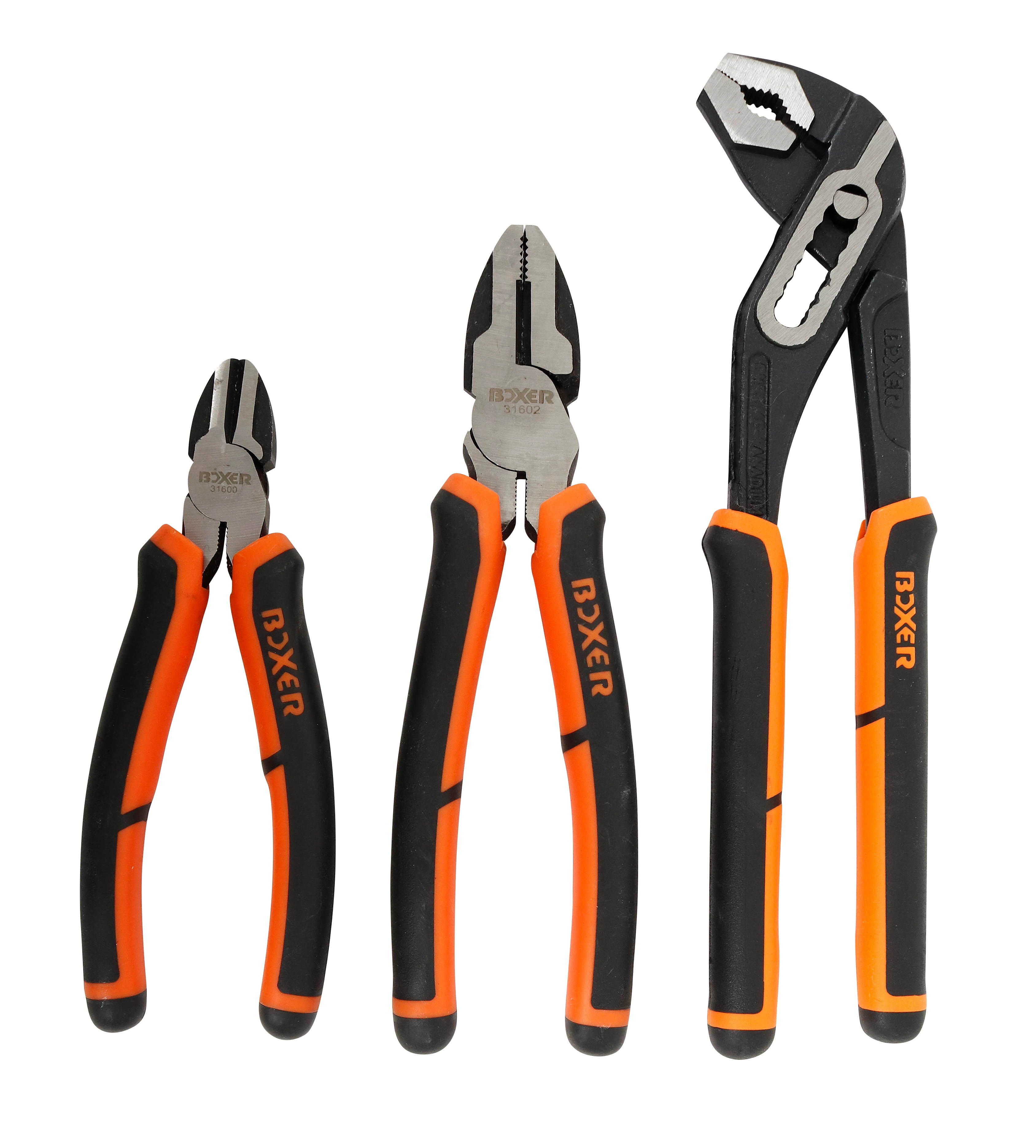 Setul de clesti Boxer include trei unelte utilizate frecvent in lucrari de montaj si intretinere: cleste cu tais lateral de 160 mm, cleste combinat de 190 mm si cleste tip pompa apa de 250 mm. Clestii sunt fabricati din otel crom-vanadiu, iar falcile sunt realizate din otel calit la 45 HRC, pentru o prindere sigura si taiere controlata. Manerele sunt izolate, permitand o utilizare sigura si confortabila. Setul este livrat ca pachet complet pentru lucrari diverse, fiind potrivit pentru uz profesional sau casnic, iar produsele beneficiaza de o garantie de 5 ani.