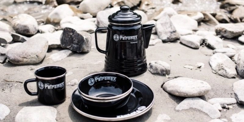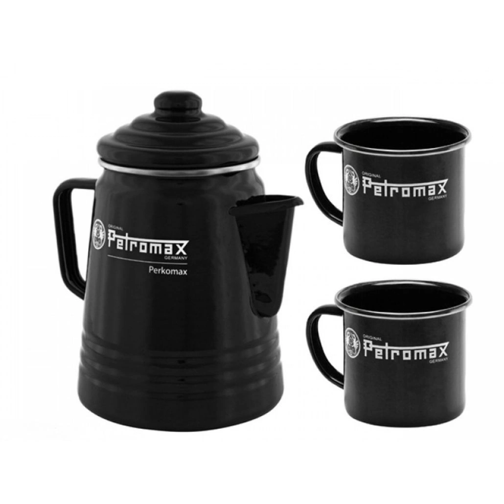 Set Petromax negru cu percolator emailat si doua cani emailate negre, potrivit pentru cafea si ceai in interior sau in aer liber. Functioneaza pe gratar ori pe plita si ofera o infuzare usoara, cu aroma intensa.
