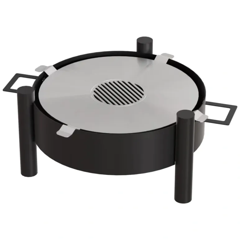 Suprafata plitei tine alimentele departe de flacara directa si distribuie caldura mai uniform, ceea ce poate reduce arderea rapida si uscarea. Constructia este portabila si se poate muta in curte in functie de spatiu si vant, folosind manerele de transport detasabile. Materialele sunt gandite pentru utilizare repetata la exterior, iar designul simplu face curatarea mai usoara dupa racire.