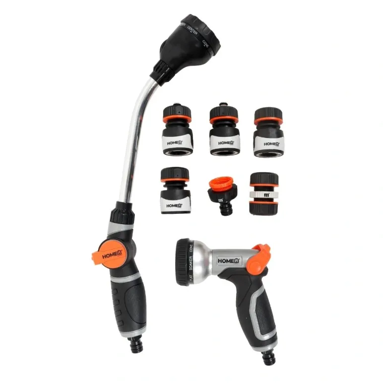 Setul de irigare HOME It Garden Premium include 8 piese esentiale pentru udarea eficienta a gradinii. Acesta contine un pulverizator de gradina cu 8 functii si un pistol de gradina cu 9 functii, permitand ajustarea jetului de apa in functie de necesitati.