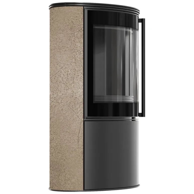Soba moderna cu ceramica Gold Satin, capac din otel, samota neagra si sticla panoramica, cu control intuitiv al aerului si captuseala TERMOTEC.