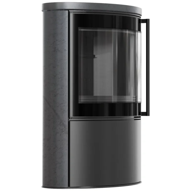 Soba pe lemne cu ceramica Grafite Satin si capac ceramic, cu sticla panoramica, TERMOTEC si samota neagra, plus sistem de sticla curata pentru o vizibilitate mai buna a focului.