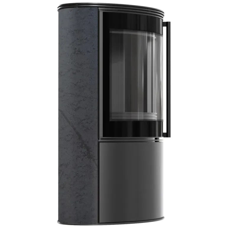 Soba pe lemne Bjorn, cu ceramica Grafite Satin, capac din otel si samota neagra, pune flacara in prim-plan prin sticla panoramica cu decor negru si sustine o ardere eficienta.