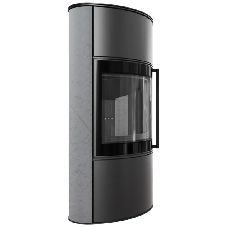 Soba pe lemne cu ceramica Gray Satin, capac din otel si samota neagra, cu sticla panoramica, admisie aer exterior si perdea de aer pentru sticla curata, cu ardere eficienta si emisii reduse.