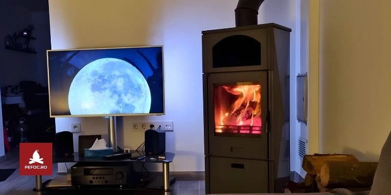 Vizibilitate panoramica a focului prin usa mare cu sticla rezistenta, creand o atmosfera placuta si relaxanta