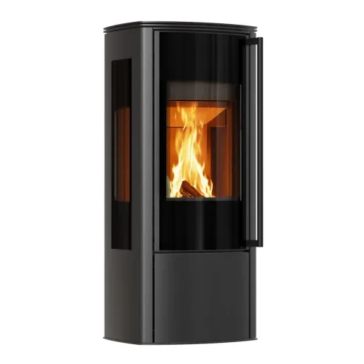 Soba pe lemne cu aspect gri satin, design modern si tehnologie avansata ofera ardere curata, eficienta termica ridicata si se integreaza perfect in locuinte moderne cu sistem de recuperare.
