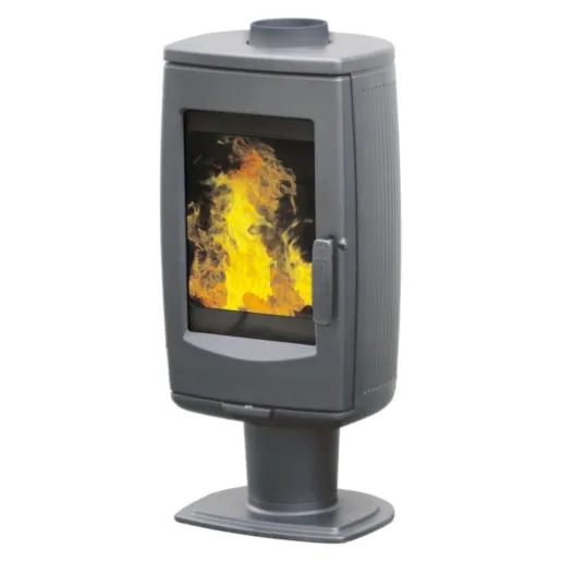 Soba moderna din otel, cu design pe piedestal, prevazuta cu interior din samota neagra pentru acumulare de caldura si rezistenta sporita. Sistemul de tripla combustie asigura o ardere completa si un randament termic optim.
