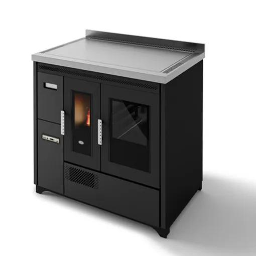 Soba deosebita pe peleti pentru incalzire prevazuta cu termostat, rezervor de peleti mediu si randament crescut. Doatata in partea superioara cu un cuptor pentru gatire, soba eficenta si practica pentru un open space.Pentru o functionare optima este necesara racordarea la un cos de fum profesional.