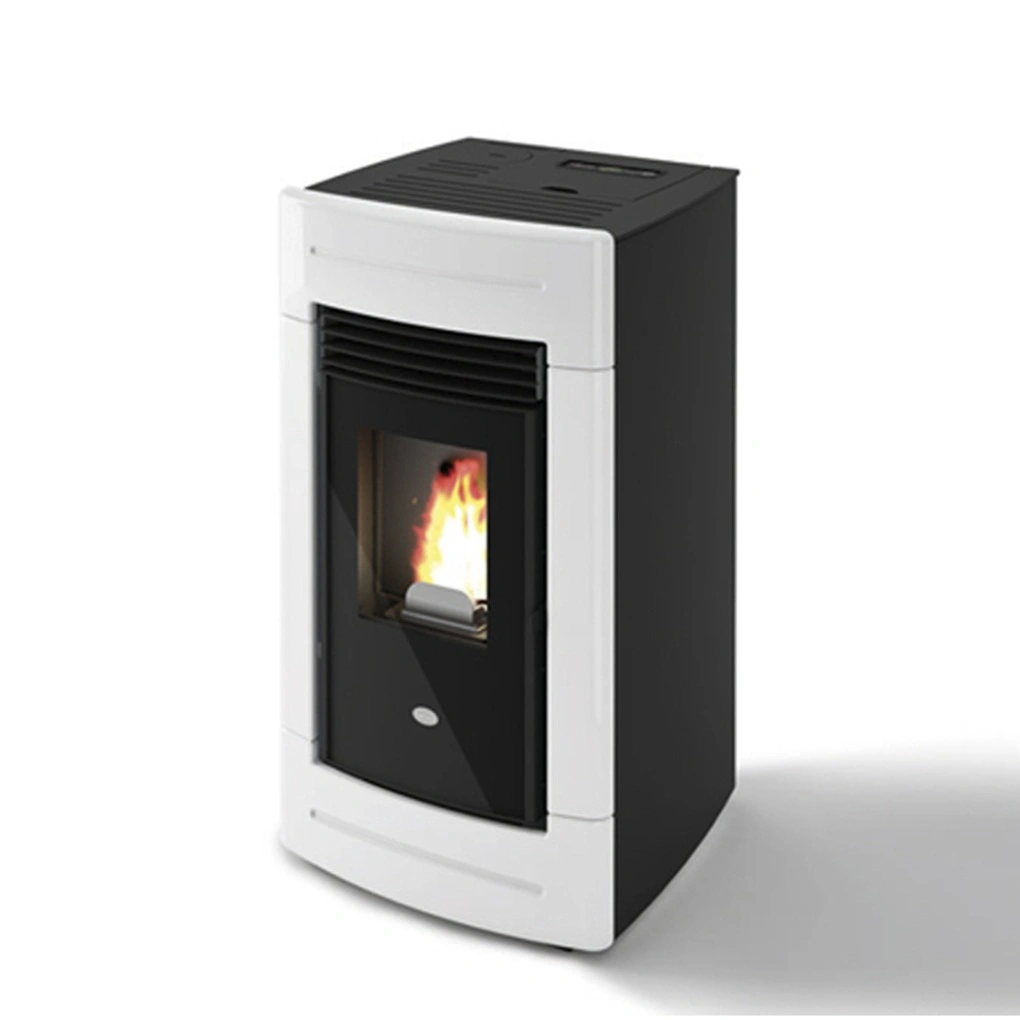Soba pe peleti cu invelis frontal placat cu ceramica de culoare alba, dotata cu ventilator integrat ce poate incalzi o incapere cu pana la 200 m3.