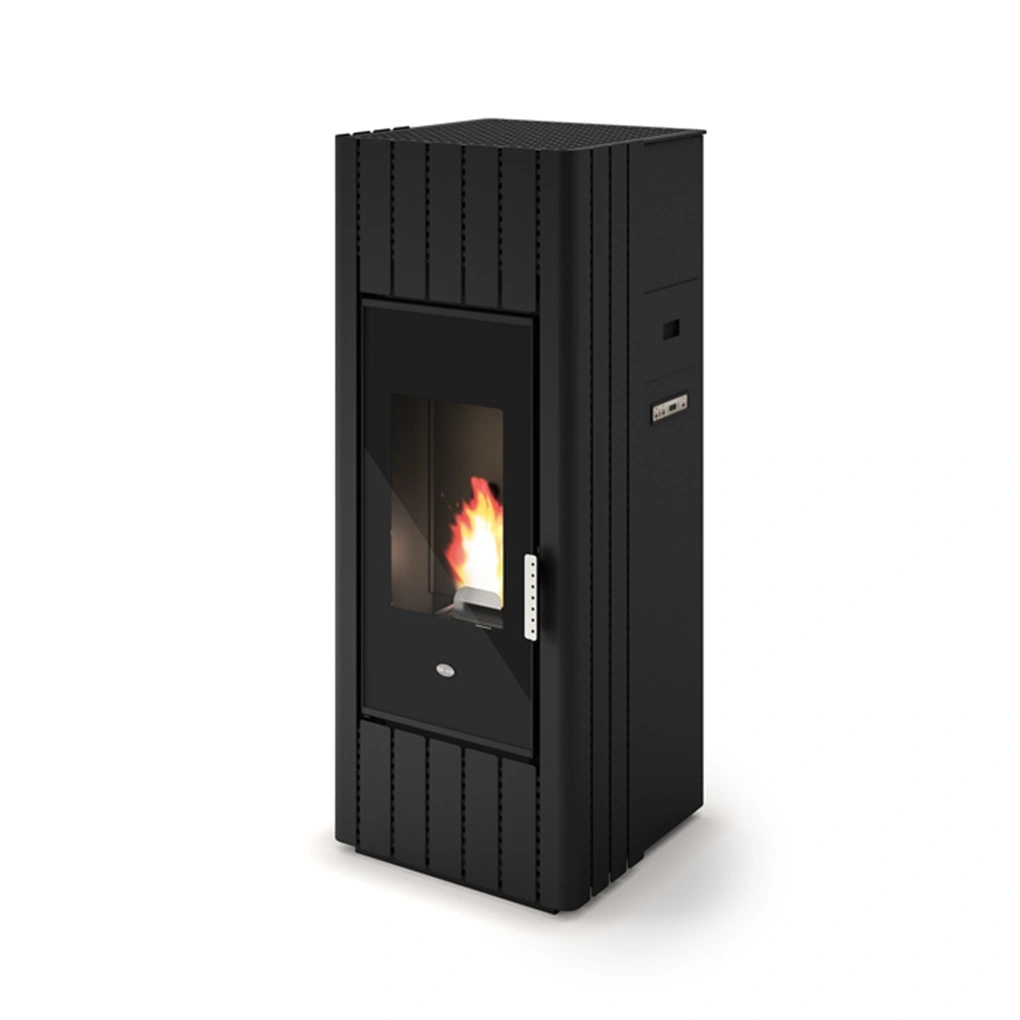 Cu dimensiuni mari soba pe peleti pentru ardere, produs ce ofera comfort dotat cu termostat, display si ventilator, Ce ofera randamente intalte si posibilitatea programari de la distanta cu un modul WI-FI optional .Pentru o functionare optima este necesara racordarea la un cos de fum profesional.